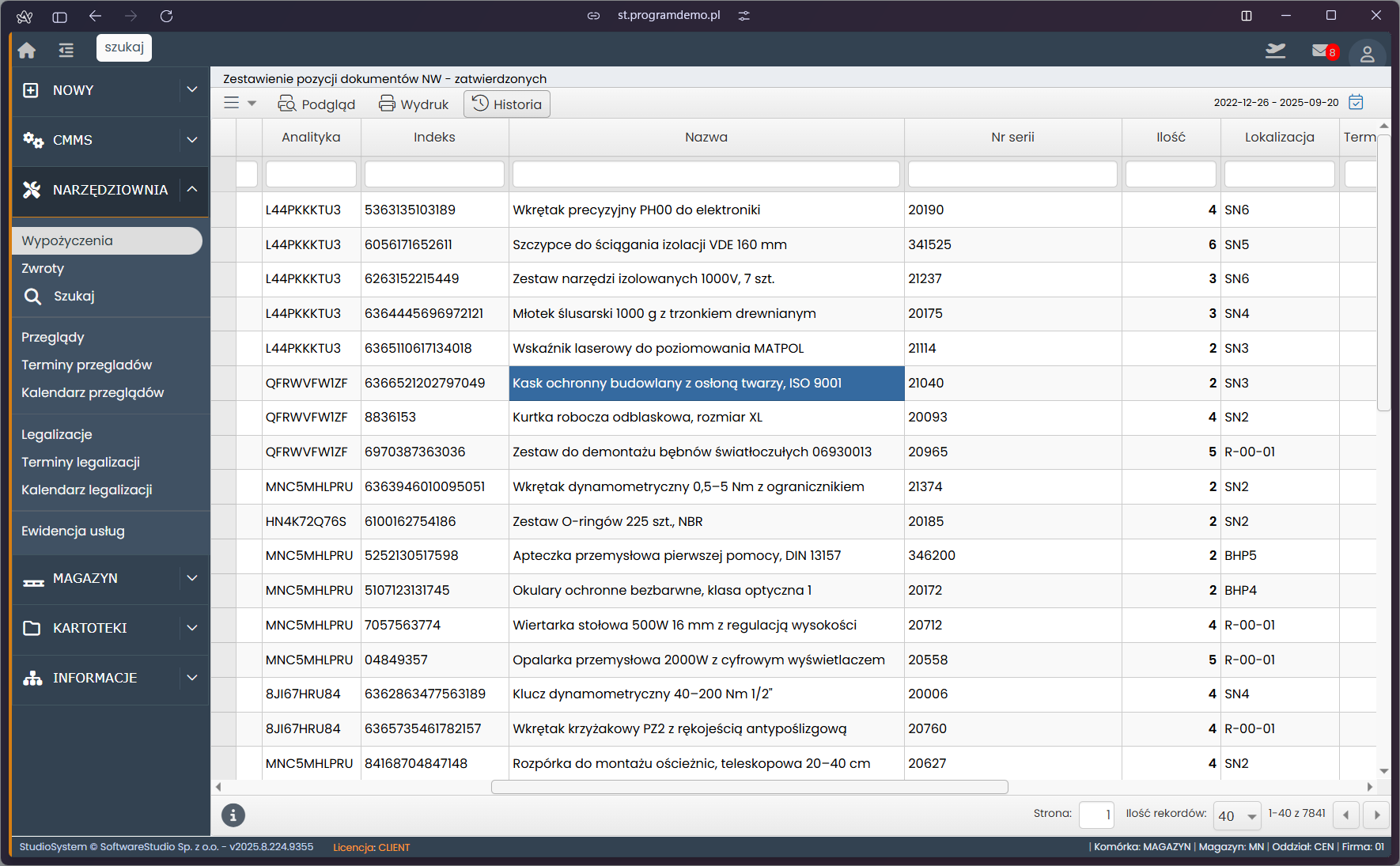 Na ekranie przedstawiono zestawienie pozycji dokumentów wypożyczeń NW (zatwierdzonych) w systemie Studio TCS.net. Centralny widok to rozbudowana tabela, w której każda linia reprezentuje pojedynczą pozycję wypożyczenia narzędzia lub środka. Widoczne są szczegółowe informacje: oznaczenie analityki, indeks magazynowy, nazwa przedmiotu, numer serii, ilość, lokalizacja oraz inne istotne dane umożliwiające identyfikację oraz kontrolę zasobów.